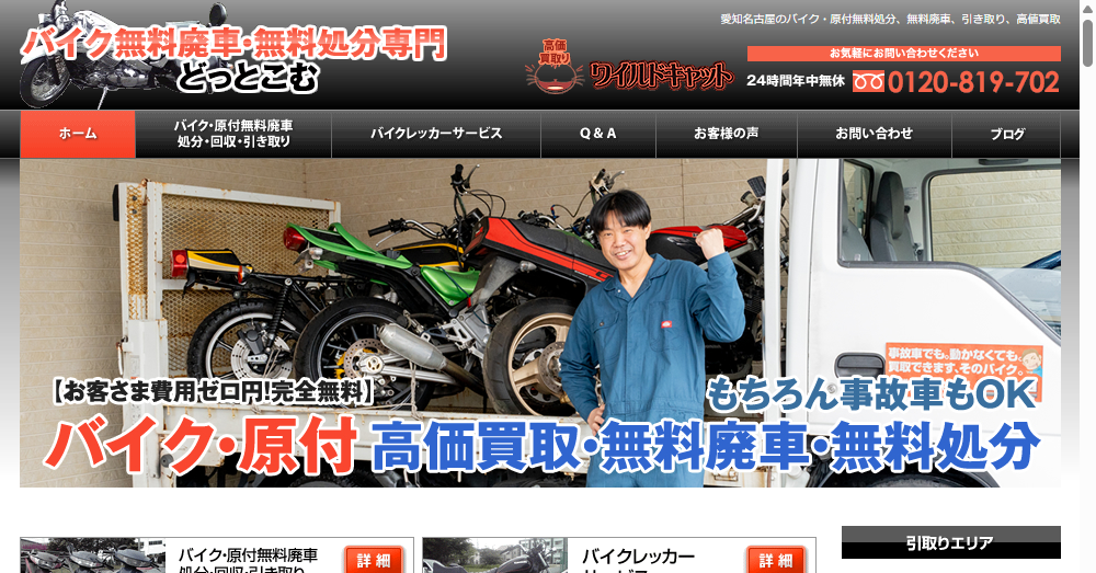 オートバイク24は、名古屋を拠点に愛知県全域でバイクの無料回収引取りや廃車手続き、高価買取を行う専門業者です。