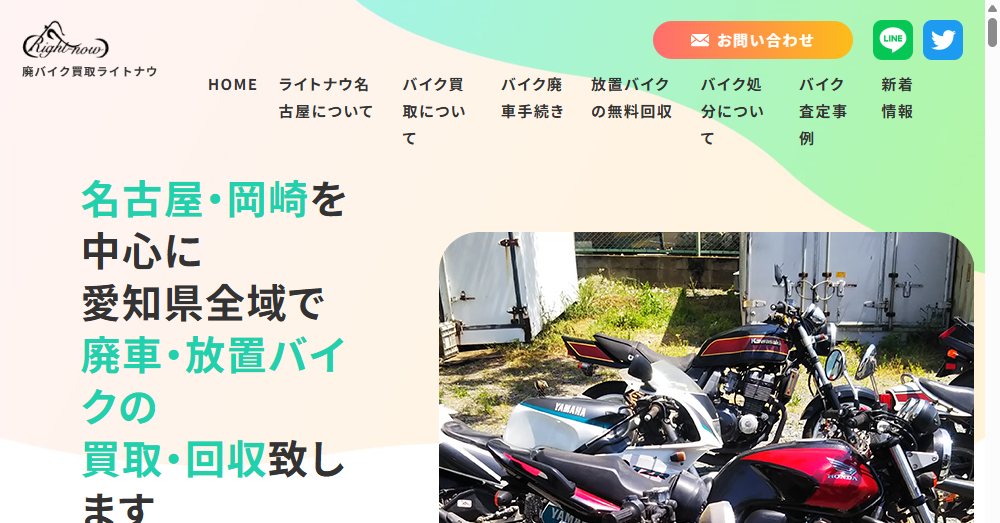 ライトナウ名古屋は愛知県名古屋市を拠点に、廃車や放置バイクの買取・回収を専門とする企業です。