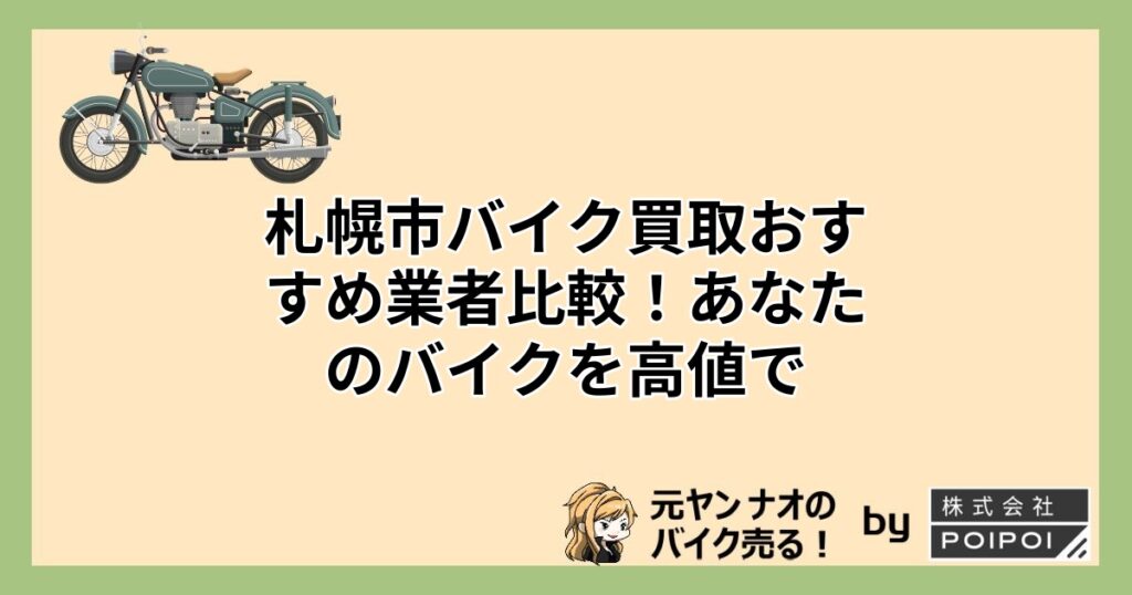 大切なバイクだからこそ高値で買い取ってもらいたいし、バイク好きな人にまた乗ってもらいたいですよね? 北海道でバイクを売るおすすめの方法はバイク専門の買取業者に査定を依頼するのがもっとも安心できて満足度の高くおすすめです。 バイク買取業者にはいくつかありますが、その中でもバイク王はバイク買取に関して総数の30%以上の買取りシェアを占めています。 家まで出張買取に来てくれるので不動車や車検切れで店舗まで持って行くことができないという方でも便利です。他社と比べれも圧倒的な買取実績があるため満足度も高いというのが特徴的ですよね。 一般的に大型にしか高額査定は不可能だとされる場合でもバイク王であれば、中型でも他社よりも高額買取を行ってくれる可能性は高いので少しでも高値で売却したいと考えている方にはとくにおすすめです! バイク王以外にも北海道にはおすすめのバイク買取専門業者があるので下記のランキングでそれぞれの特徴を知っておいてくださいね。