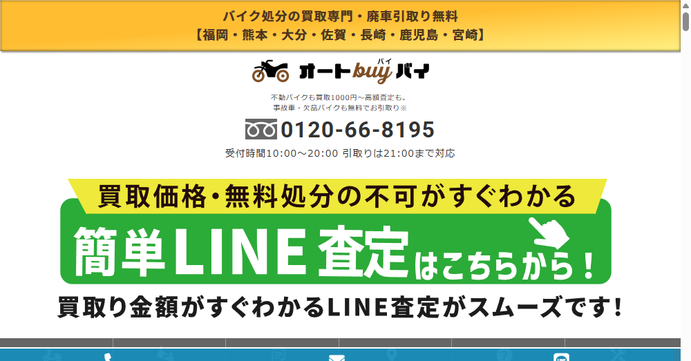 • 創業20年以上の実績を持つ「オートバイバイ」は、福岡・熊本・大分・佐賀・長崎エリアでのバイク処分を専門に行い、顧客満足度の高いサービスを提供しています。