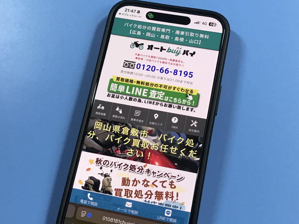 • 岡山県倉敷市で20年以上の実績を持つオートバイバイは、事故車や不動バイクも最低1,000円から買取り、高額査定にも対応しています。