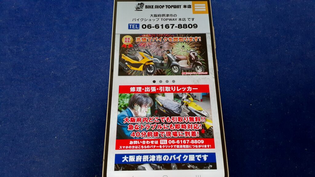 - 大阪府摂津市に位置するBIKESHOP TOPWAYは、原付から大型バイクまで幅広い車両を取り扱い、業者オークションや一般ユーザーからの買取で多様な在庫を確保しています。