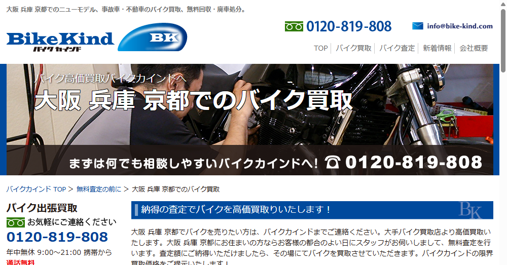 バイクカインドは大阪 兵庫 京都を中心にバイク買取、無料回収、廃車処分を行う専門店です。