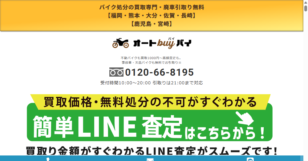 - オートバイバイは、福岡・熊本・大分・佐賀・長崎エリアで、事故車や不動車も含めて無料引取りを行い、3000円買取キャンペーンを実施中です。