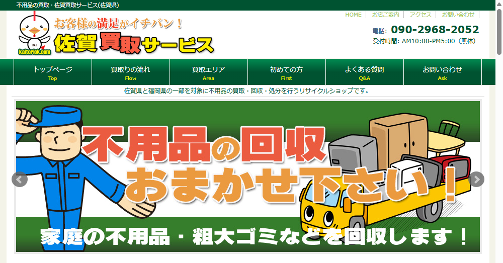 - 佐賀県と福岡県の一部を対象に、電化製品や家具などの不用品を高価買取・回収する専門店。出張買取サービスも充実。
