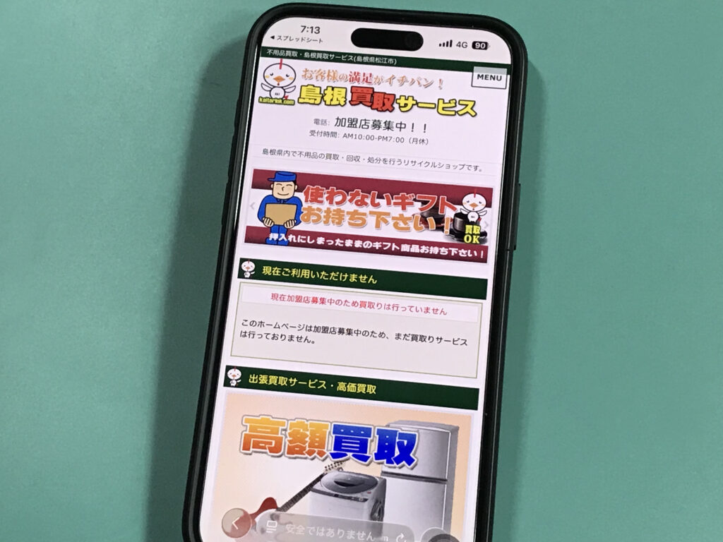 島根買取サービスは島根県松江市に位置するリサイクルショップで、現在は加盟店募集中のため買取サービスは行っていません。