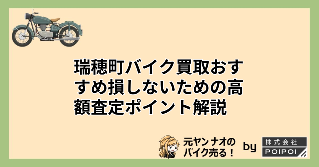 【高価買取!】瑞穂町でバイクを高く売りたいあなたへ。バイク買取出張査定なら家にいながらバイクを高く売ることができます。このサイトではあなたのバイクが高く売れる買取店をランキング形式でご紹介しています。