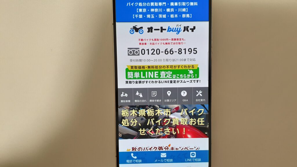 • 創業20年の実績を持つオートバイバイは、東京・神奈川・千葉・埼玉・茨城・栃木・群馬エリアでの出張買取に対応し、顧客満足度の高いサービスを提供。