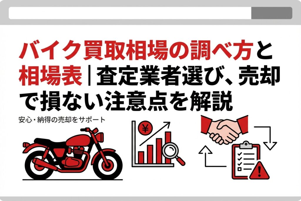 バイク買取相場の調べ方と便利なサービス 愛車のバイクを売るとき、一番気になるのは「いくらで売れるのか」という買取相場ですよね。 相場を知らないまま査定に出すと、本来の価値よりも安く買い叩かれてしまうかもしれません。 ここでは、誰でも簡単にバ...