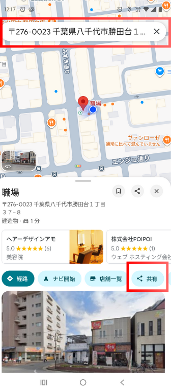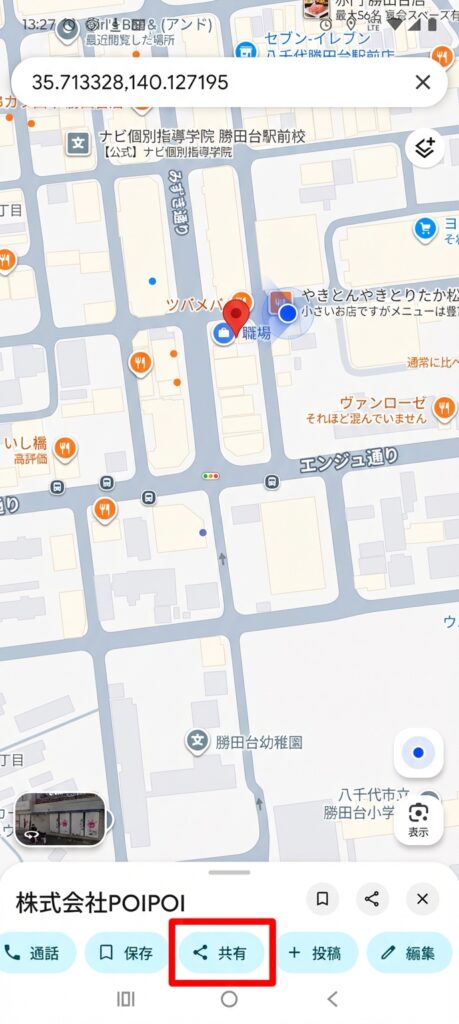 地図に赤いピンが表示されますので、場所が合っているか確認してください。 問題なければ、画面下のメニューにある「共有」ボタンをタップします。