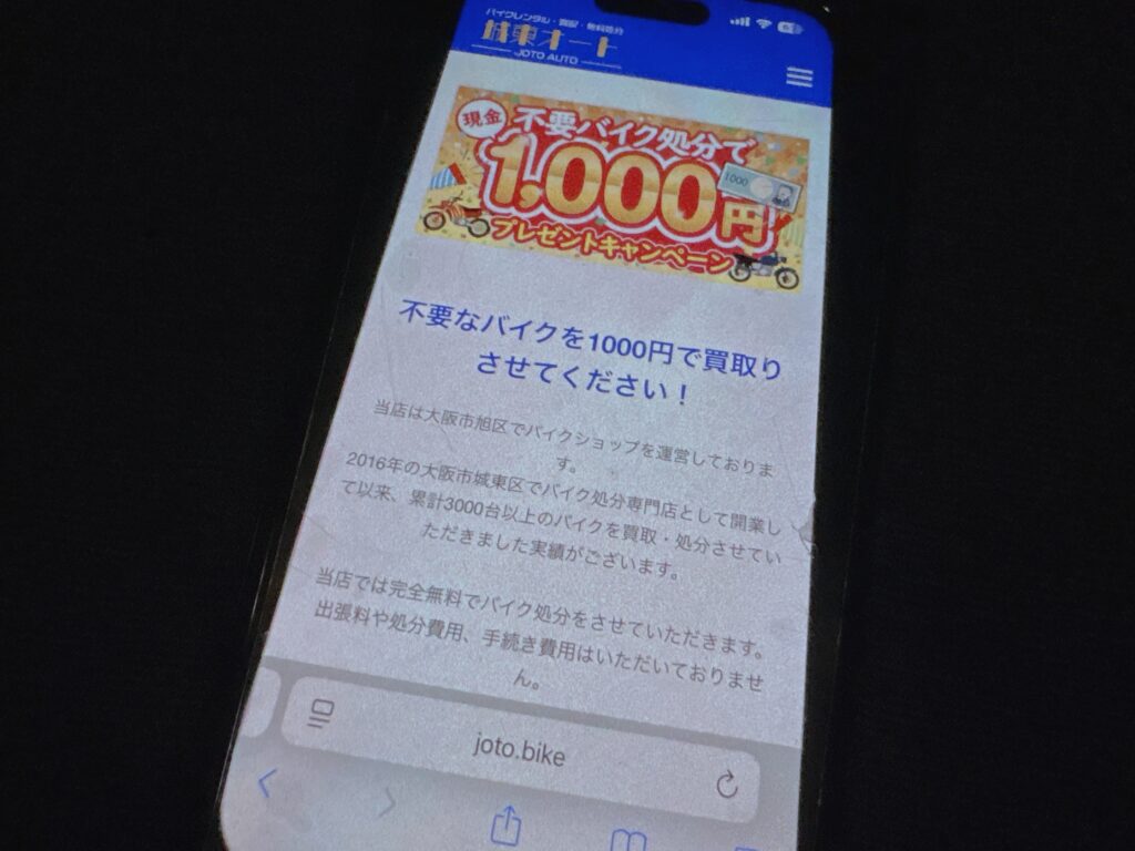 主な強みは不要なバイクを1000円で買取り、店舗持ち込みの場合は3000円で買取る点です。